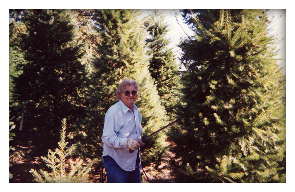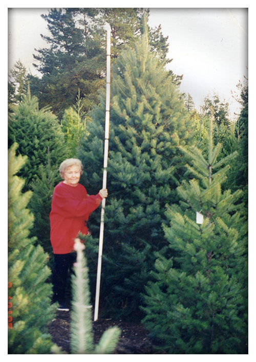 Grandma Buddies tree farm was first planted in 1982. Formerly having an apple orchard, Hazel and her husband Gilbert had also raised chickens, during the years when they had a poultry business. (The “wreath” barn is the last remaining “chicken” barn.) Their son Del had already started his Christmas tree farms, and it seemed like a good thing to do with their land. Planting mostly pines back then, Hazel and Gilbert thought it would be something to keep them busy during their retirement years. Tree farms are a lot of work, but Grandma Buddy was no stranger to this. After Gilbert passed away at the end of 1983, she kept the farm going with the help of her oldest grandson, Gary, and her daughter Sylvann and son-in-law Tom. Over the years the family has expanded, and many things have changed on the farm. Grandma Buddy continued to work in the field, spraying with a backpack in her late 80’s. You could usually find her in the barn at Christmas time. On February 26, 2006, one week after her 93rd birthday, she passed away. We miss her, but her spirit lives on in our hearts. She loved to see kids of all ages smile, and she loved Christmas!